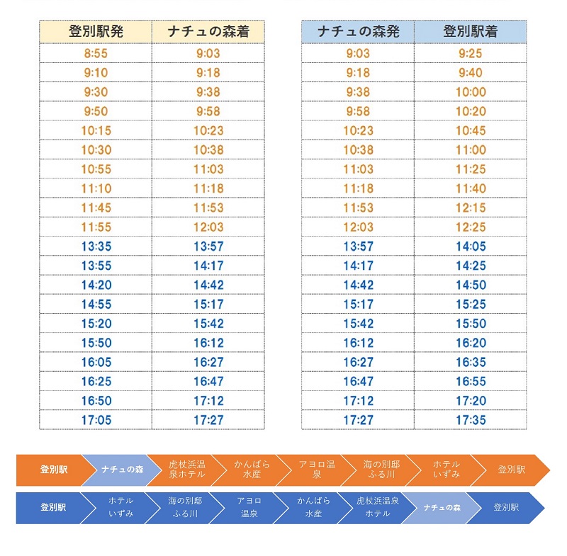 金・土・日、祝日・祝前日は、登別駅から無料循環バス「ゆたら号」でナチュの森にお越しいただけます。