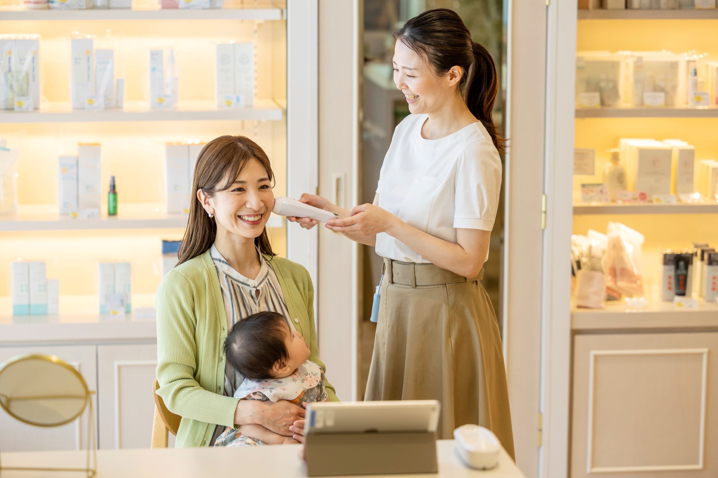 直営店では、一人ひとりへのお肌のカウンセリングを行っています。赤ちゃんからご年配の方まで、その場で肌測定とカウンセリングを行い、お肌のタイプや年齢に合ったスキンケアアドバイスをさせていただいています。