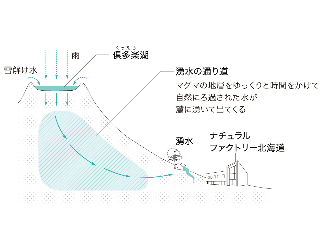 倶多楽湖は水深148m、周囲8kmの雄大なカルデラ湖。流入・流出する川がなく全国の水質1位※にも選ばれています。冬は全面凍り、春から秋にかけては、湖畔の限られた場所にしか入ることができません。雪と雨からなる「天水」のみが溜まったこの湖には、水を汚すプランクトンもいないのです。そのため、その水質は国内屈指の透明度を誇るピュアなもの。底からは、マグマの地層を通った地下水が流れ出て、山裾で湧き出しています。