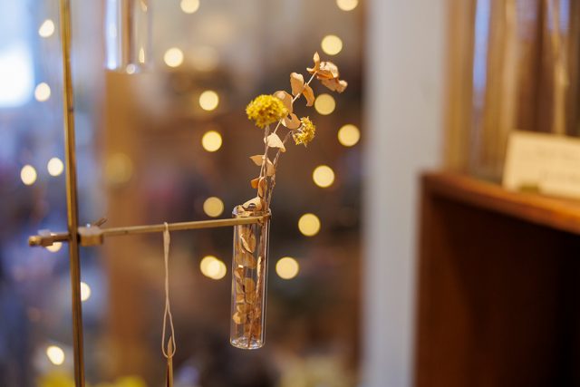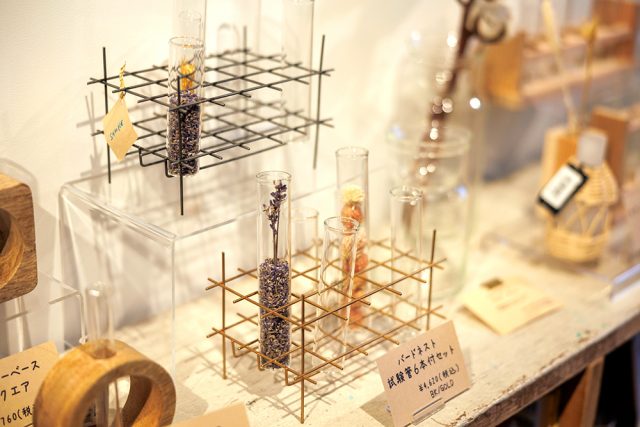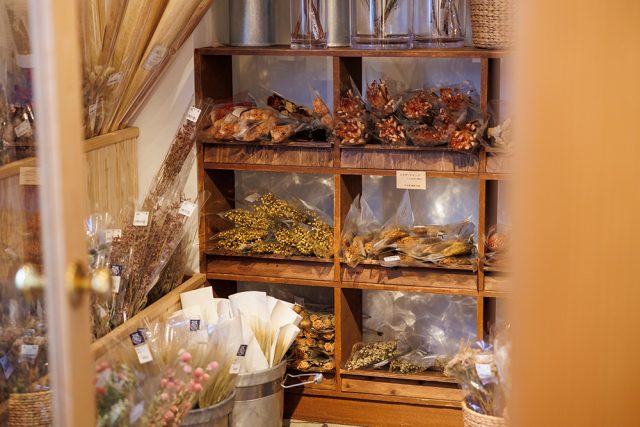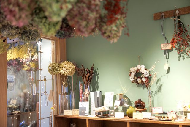 ドライフラワーや理科学道具などユニークな雑貨が揃うお店。
