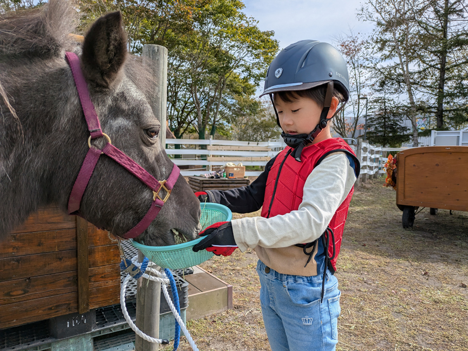 やわらかくしたキューブやチモシー、ニンジンなど混ぜて、ご飯をあげるエサやり体験。 - ⑦ミニポニーとふれあい・写真撮影